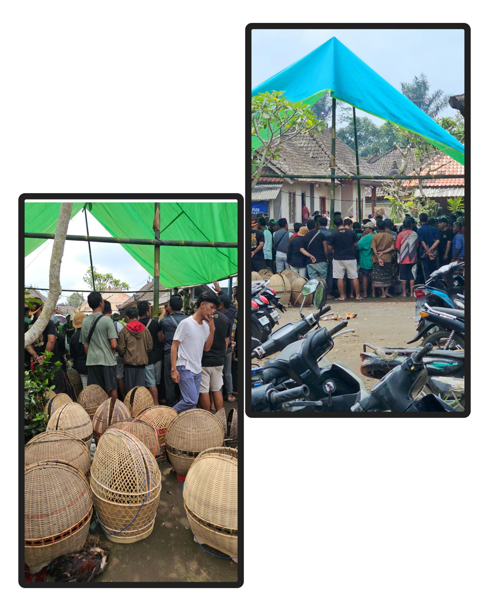 Unauthorized (betting) cock fighting gathering in a village we pass through. Baskets each contain a cock waiting (or not) for action