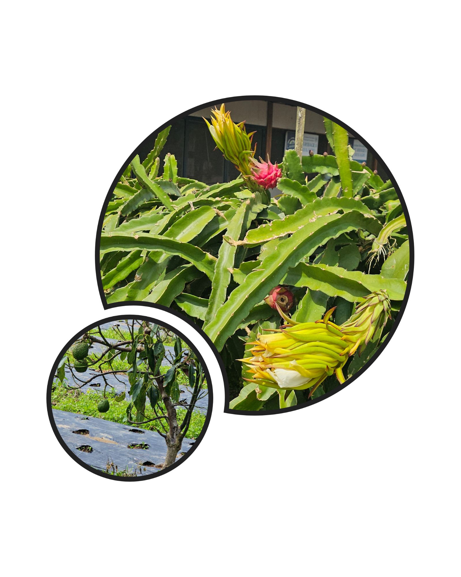 Pitaya – dragon fruit and its flower cooked as a vegetable; avocato tree- island grows three kinds. Think this is Hass.
