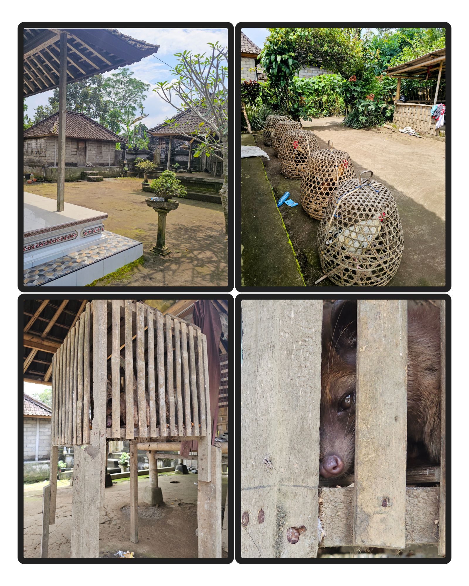 Family cocks in cages and curious civet